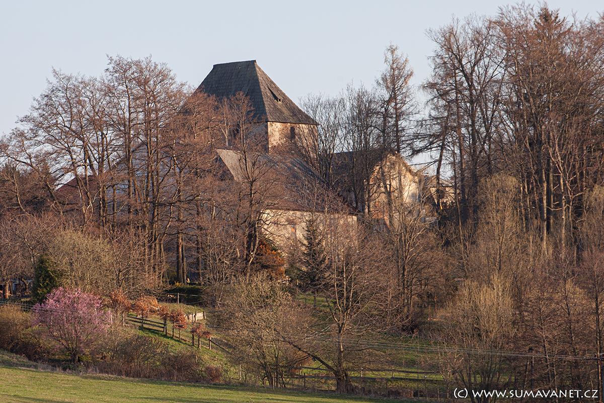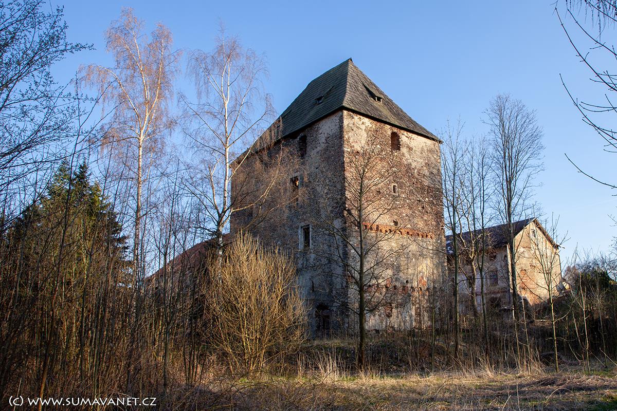 Mohutná věž čachrovské tvrze je dodnes dominantou obce, nicméně je obklopena velkým množstvím vzrostlých stromů, které ji zastiňují.