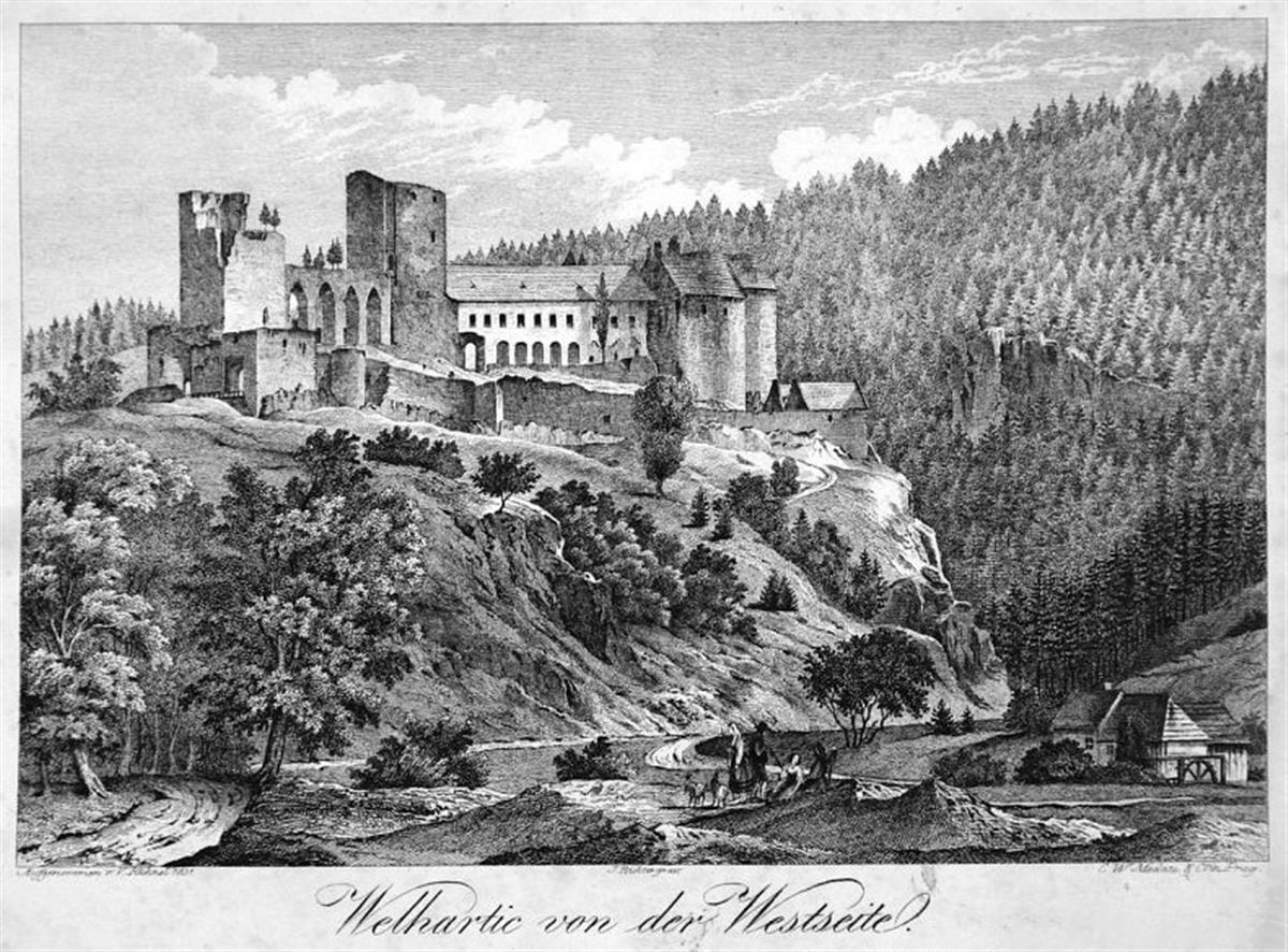 Hrad Velhartice byl založen na přelomu 13. a 14. století na skalním ostrohu, obtékaném říčkou Pstružnou. Tento hrad si patrně jako rodové sídlo pánů z Velhartic počal stavět Bušek starší z Velhartic, hrad dostavoval Bušek mladší, oba byli věrní a oblíbení komorníci Karla IV.